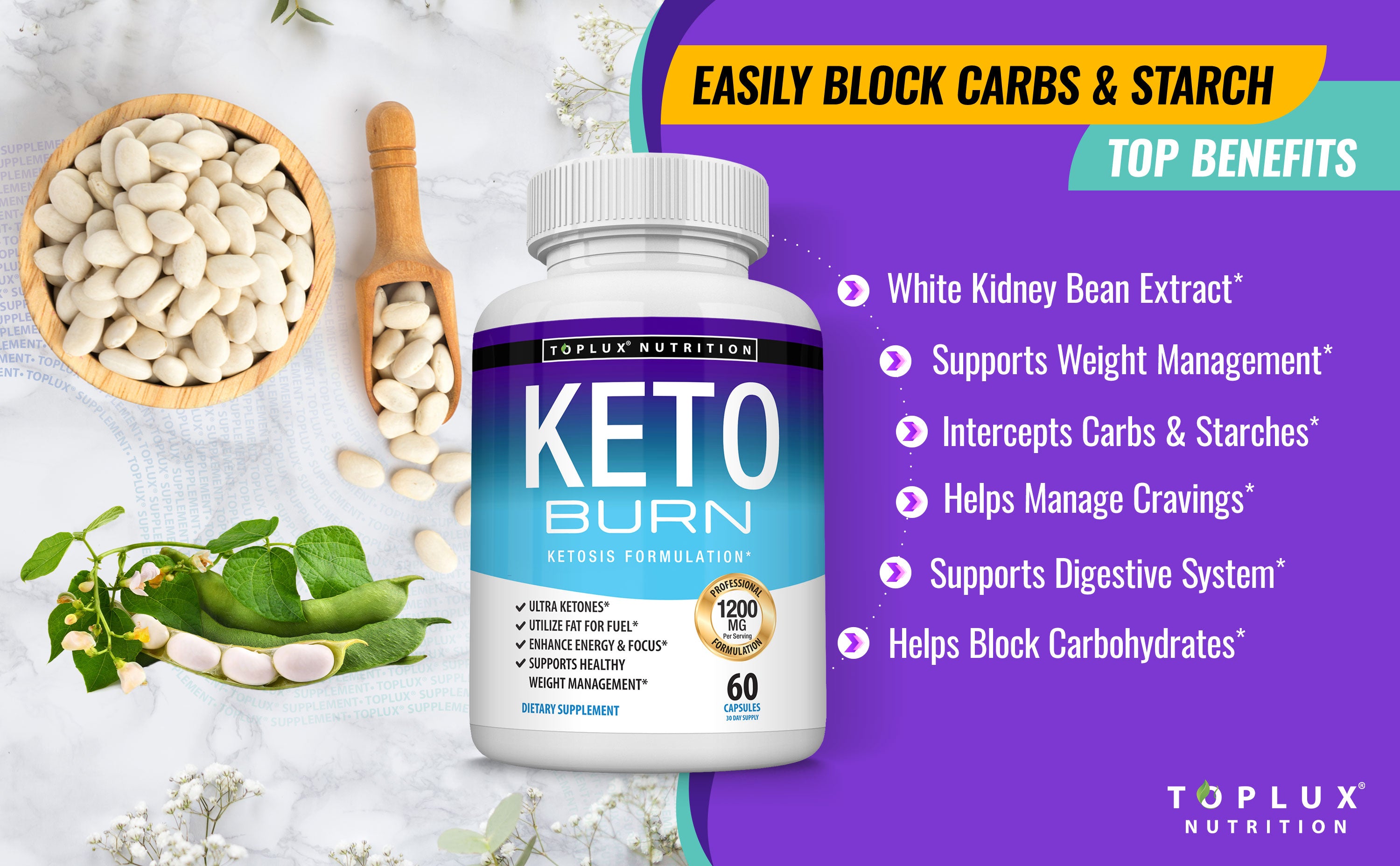 Keto Blocker supports your ketogenic diet and lifestyle by naturally with white kidney bean. White kidney bean reduces the absorption and digestion and helps your body store few food. Keto Blocker helps with the alpha-amylase enzyme, allowing you to eat in moderation so you don’t feel deprived. Our high-potency formula contains 1200 mg of white kidney bean extract, which helps you find success with keto diet.*